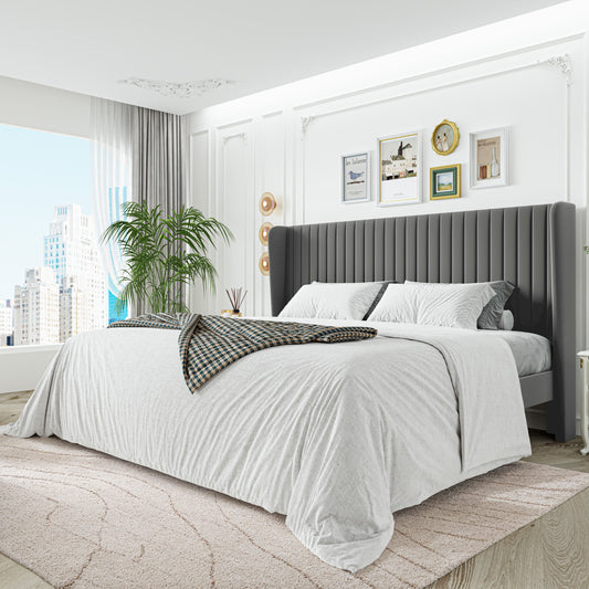 Sha Cerlin Upholstered Platform Bed Frame with Velvet Channel Wingback Headboard
