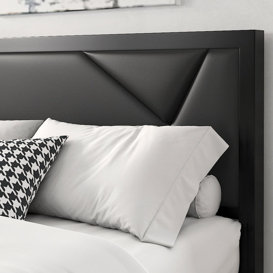 Metal Bed Frame with Geometric Litchi Grain Leather Headboard