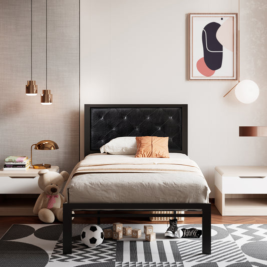Metal Platform Bed Frame with Headboard, Faux Leather Button Tufted Square Stitched Design