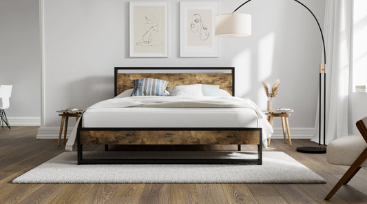 Metal Bed Frame with Wooden Industrial Headboard, Noise Free Design