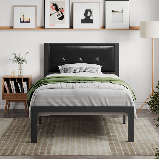 Metal Platform Bed Frame with Headboard, Faux Leather Button Tufted Square Stitched Design