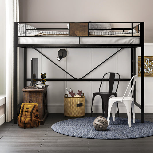 Metal Loft Bed Frame with Full-Length Guardrail, Wood Decoration