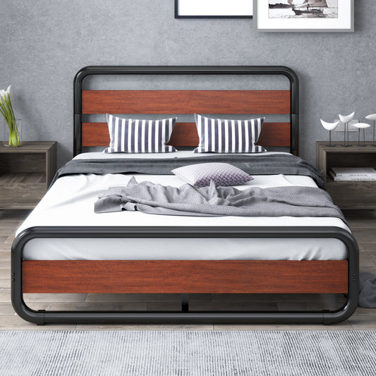 Metal Platform Bed Frame with Wooden Headboard and Footboard