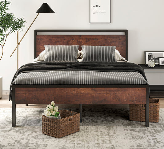 Metal Platform Bed Frame with Wood Headboard and Footboard