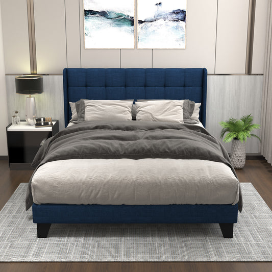 Wingback Upholstered Bed with Square Stitched Headboard, Mattress Foundation