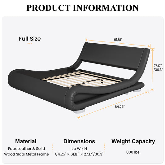 Upholstered Bed Frame, Deluxe Low Profile Sleigh Bed with Faux Leather Ergonomics Headboard